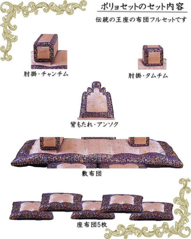 シルクの韓国布団で韓国の王様、王妃気分を満喫! 韓国ドラマの王座の布団ポリョセット コンジュ キラキラ輝く折り柄糸を使いパープル系でまとめた上品なシルクポリョセット 生地は光沢があり、織り柄がさらにゴージャスです 両肘掛や背もたれ、敷布団と座布団5枚が全てセットになっており、とても大きな荷物ですが、特別便での韓国からの空輸代と国内でのお届け送料分約もすべて価格に含まれております韓国で直接買われるよりもお得です お部屋の雰囲気がグレードアップすること間違いないこちらのポリョセットは、和室やご両親、祖父母様のお部屋にもおすすめです ポリョセットをお父様への還暦祝いのプレゼント、新築祝い、ご自分へのご褒美等色々とご利用いただけます。