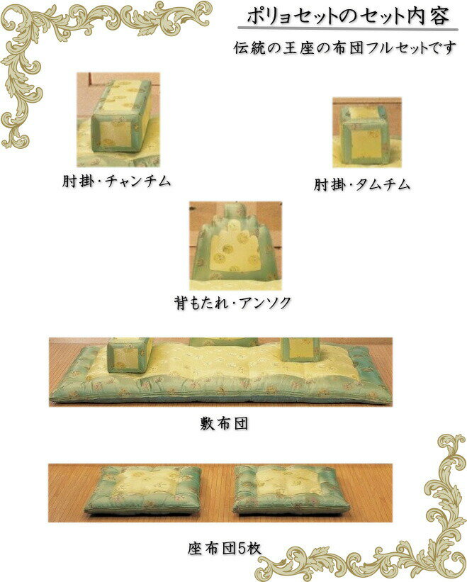 シルクの韓国布団で韓国の王様、王妃気分を満喫! 韓国ドラマの王座の布団ポリョセット ヨングム 若草色と薄黄色で仕上げた上品なシルクポリョセット 生地は光沢があり、とても滑らか、織り柄が施されさらにゴージャスです 韓国ドラマで見る王座の布団 両肘掛や背もたれ、敷布団と座布団5枚が全てセットになっており、とても大きな荷物ですが、特別便での韓国からの空輸代と国内でのお届け送料分約もすべて価格に含まれております 韓国で直接買われるよりもお得です お部屋の雰囲気がグレードアップすること間違いないこちらのポリョセットは、和室やご両親、祖父母様のお部屋にもおすすめです ポリョセットをお父様への還暦祝いのプレゼント、新築祝い、ご自分へのご褒美等色々とご利用いただけます。