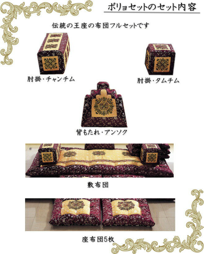 刺繍入り布団で韓国の王様、王妃気分を満喫! 韓国ドラマの王座の布団ポリョセット ヨンゲ 伝統柄の織生地を使った縁取りのエンジ色が引き立つ素敵なポリョセット 生地は光沢があり、とても滑らか、刺繍が施されさらにゴージャスです 韓国ドラマで見る王座の布団 韓国工場直での仕入れにより格安にてオーダーメイドを受注いたします 両肘掛や背もたれ、敷布団と座布団5枚が全てセットになっておりとても大きな荷物ですが、特別便での韓国からの空輸代と国内でのお届け送料分約もすべて価格に含まれております韓国で直接買われるよりもお得です お部屋の雰囲気がグレードアップすること間違いないこちらのポリョセットは、和室やご両親、祖父母様のお部屋にもおすすめです。