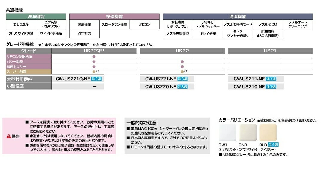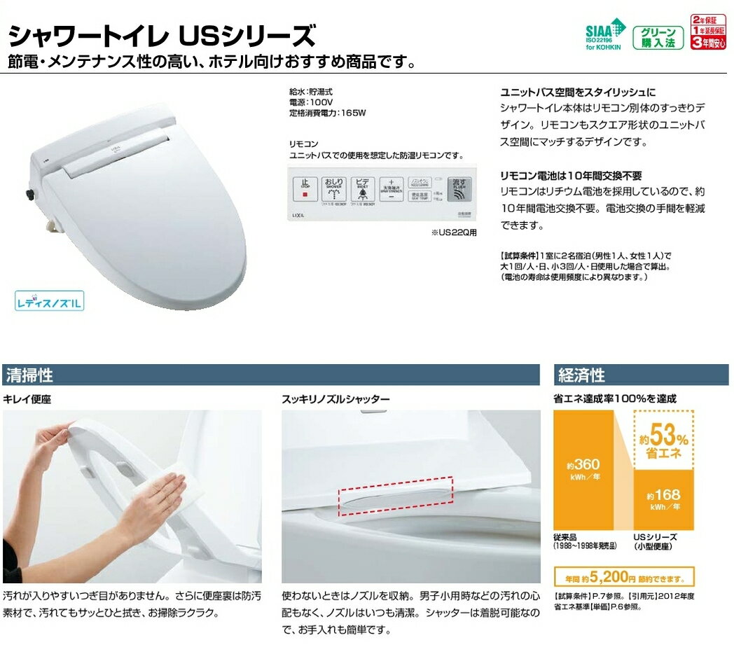 【お買い求めは安心の「etile楽天市場ショップ」で】シャワートイレ USシリーズ 品番 CW-US221-NE/BW1 カラー:BW1(ピュアホワイト) 節電・メンテナンス性の高い、ホテル向けおすすめ商品です。