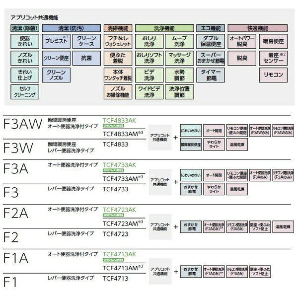 TOTO温水洗浄便座ウォシュレット[アプリコット・apricot] TCF4733 大形普通兼用 アプリコットF3 レバー便器洗浄タイプ 個別機能 においきれい オートeco小 おまかせ節電 オート開閉 リモコン便座・便ふた開閉 やわらかライト 温風乾燥 共通機能 清潔(除菌):便器きれい・ノズルきれい・きれい仕上げ・セルフクリーニング 清潔(防汚):プレミスト・クリーン便座・クリーンノズル・クリーンケース・抗菌 清掃機能:フチなしウォシュレット・便ふた着脱・本体ワンタッチ着脱・ノズルお掃除機能 洗浄機能:おしり洗浄・おしりソフト洗浄・ビデ洗浄・ワイドビデ洗浄・ムーブ洗浄・マッサージ洗浄・水勢調節・洗浄位置調節 エコ機能:ダブル保温便座・スーパーおまかせ節電・タイマー節電 快適機能:オート便器洗浄(大・小)・リモコン便器洗浄・オートパワー脱臭・脱臭・暖房便座・着座センサー・リモコンTOTO TCF4733
